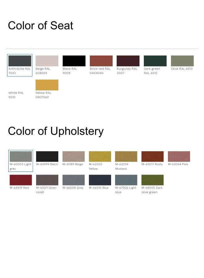 Seat - polypropylene + cushion - moulded foam, flame retardant, density of 50 kg/m³, upholstered;