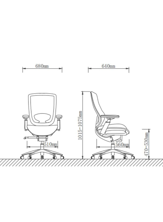 • أبعادها هي كما يلي: عرض الكرسي - 680 ملم، عمق الكرسي - 640 ملم، ارتفاع الكرسي - 1015 ملم إلى 1075 ملم.