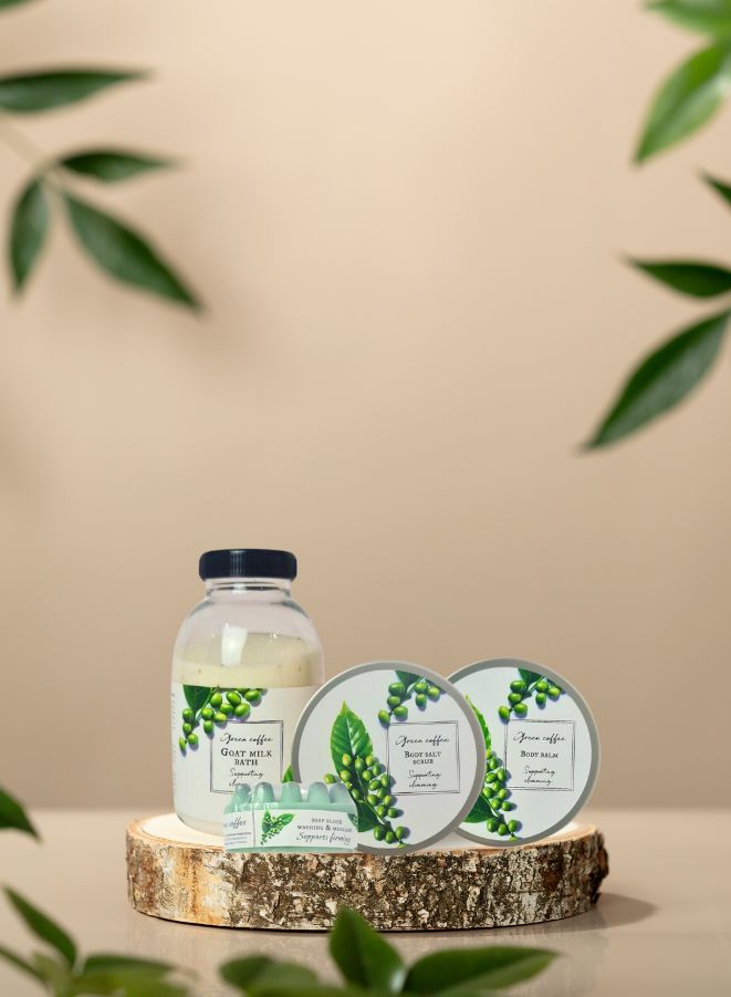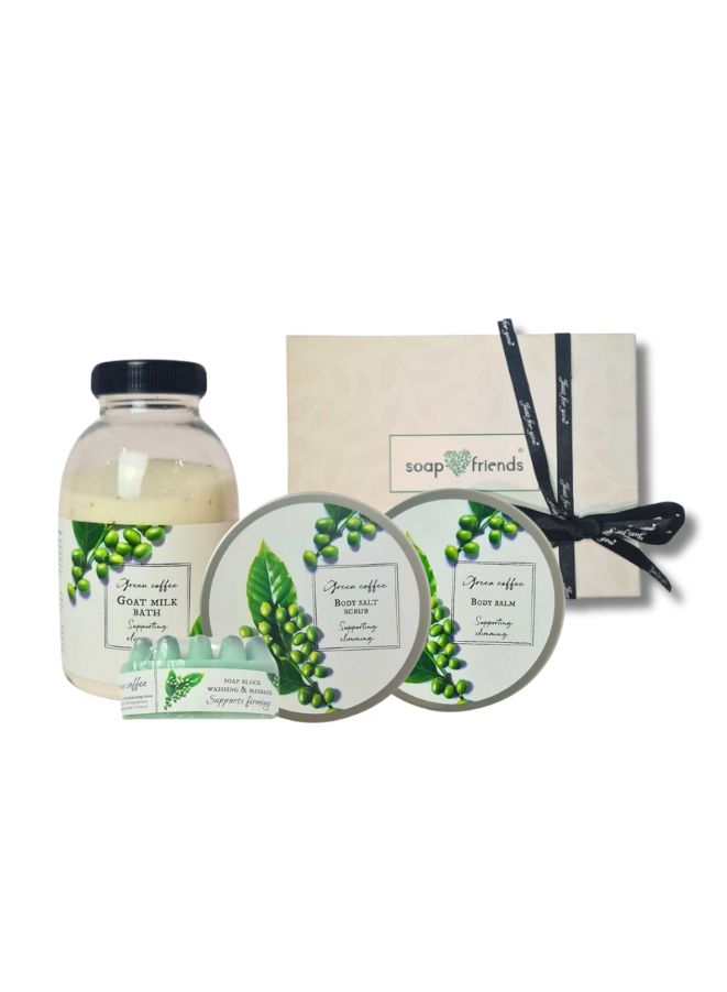 Revitalize Your Skincare Routine with the Green Coffee Slimming Bath Milk, Body Balm, Body Scrub & Massage Block Gift Set by Soap & Friends!