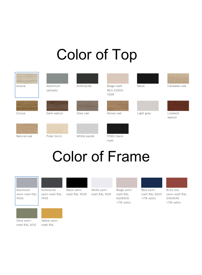 Foot: Basic - powder-coated metal, option with extra charge: Pro - aluminium, powder-coated or polished;