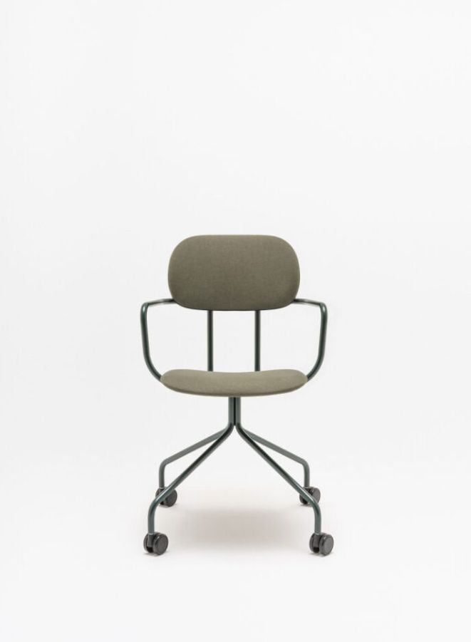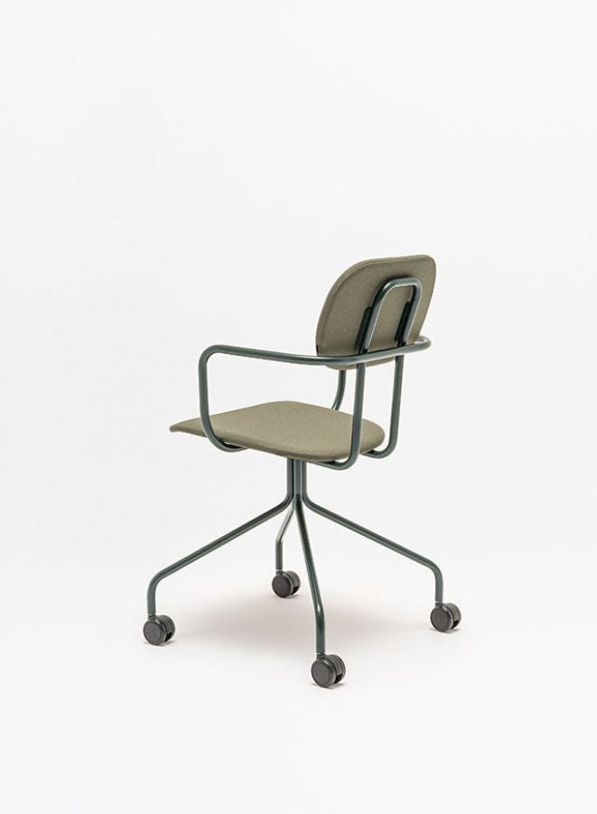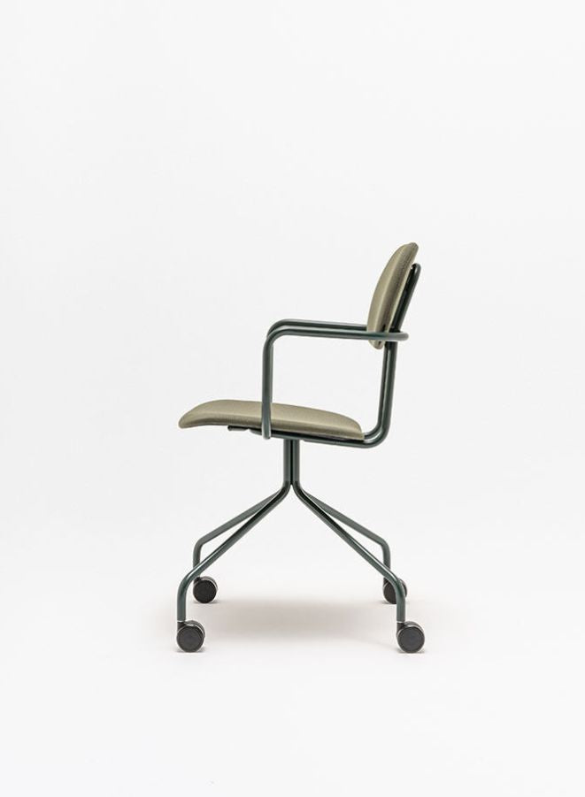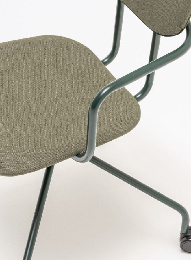 The upholstered version provides a soft and comfortable experience, making it ideal for prolonged sitting periods. For enhanced comfort, optional armrests can be added. The chair's fixed base with castors allows for easy mobility, enabling users to adjust their position effortlessly and get up from the table with ease. Made from high-quality upholstery materials, including some sourced from post-consumer recycling, this chair is both luxurious and environmentally conscious.