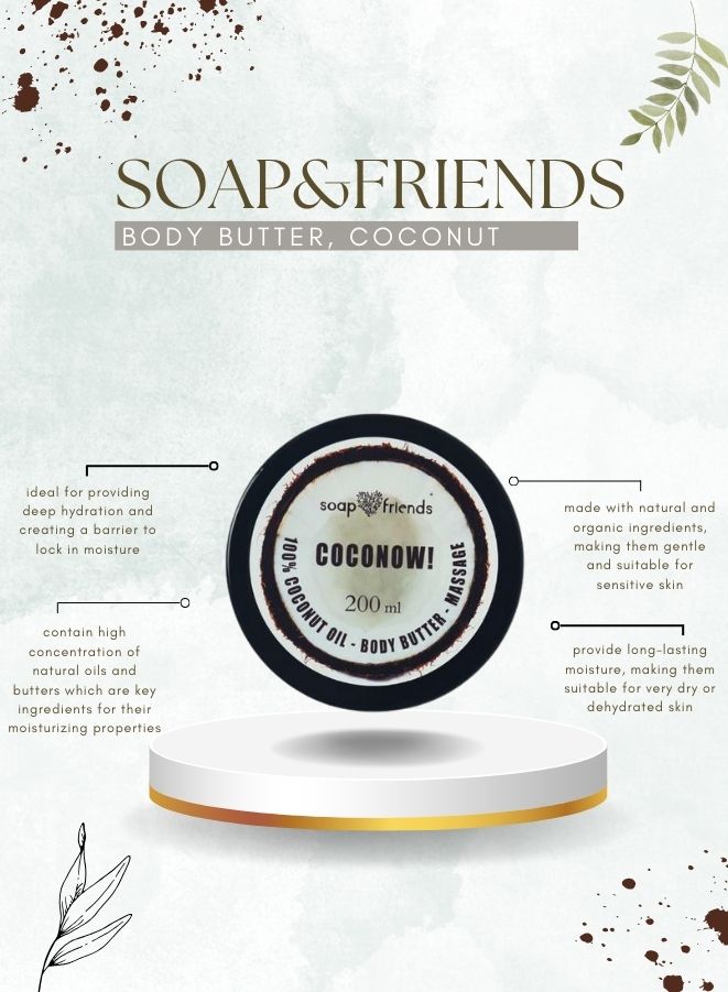 Indulge in luxurious hydration with Soap&Friends 100% Pure Coconut Butter Body Butter. Made from premium-quality coconut butter, this rich and creamy formula provides intense moisturization for your skin. Enriched with natural vitamins and antioxidants, it nourishes and revitalizes dry, dull skin, leaving it feeling soft, smooth, and deeply hydrated. Pamper yourself with the tropical bliss of coconut butter and experience velvety-smooth skin all day long.