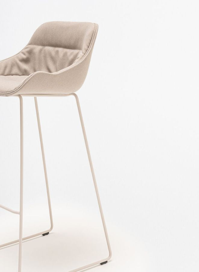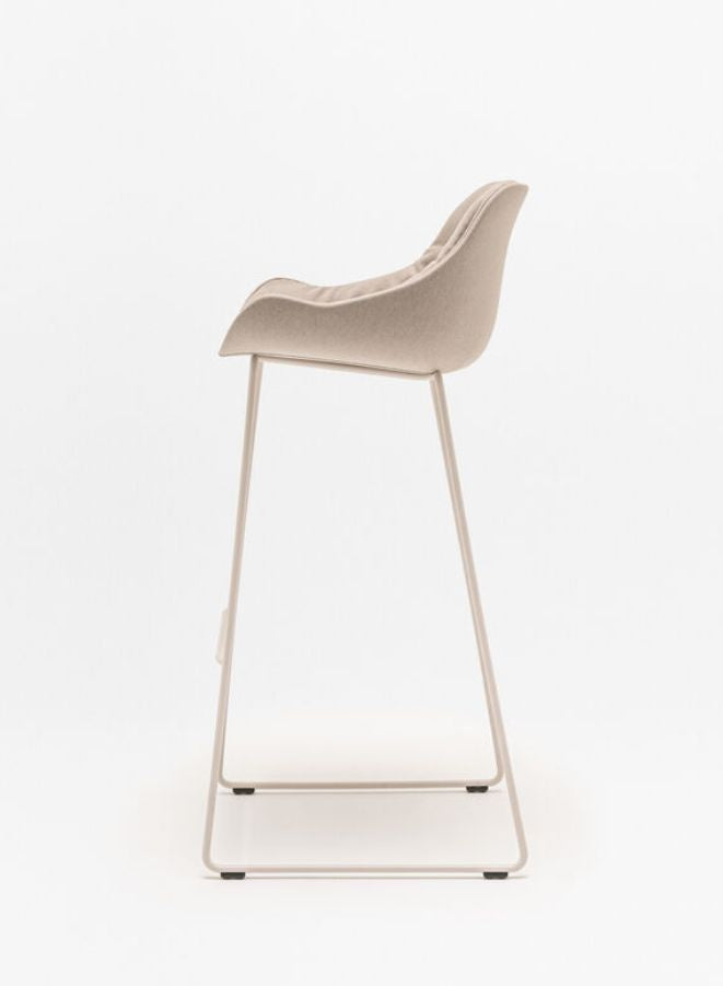 Elevate your seating with our versatile Upholstered Bar Stool, designed to blend comfort, style, and sustainability. Featuring an upholstered seat with a draped cushion and integrated armrests, this stool ensures a cozy and supportive experience in any setting. The high powder-coated metal base not only provides robust stability but also adds a modern touch to its design. Crafted from recyclable materials and upholstered with high-quality fabrics, including post-consumer recycled content, it reflects our commitment to environmental responsibility.