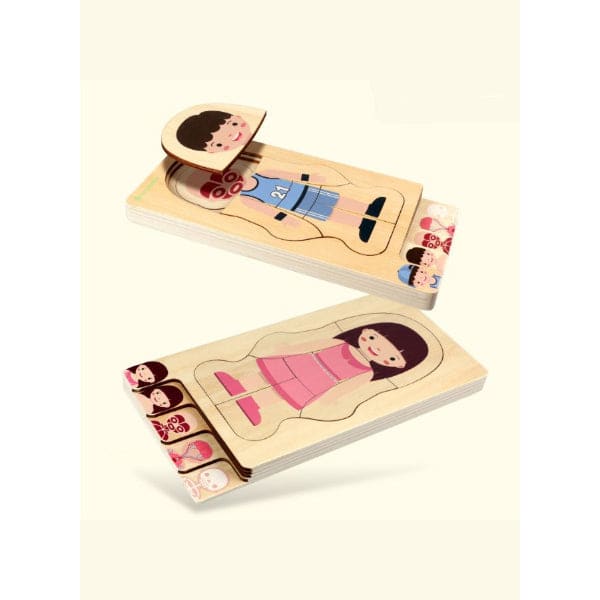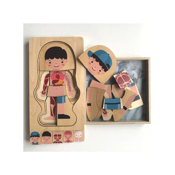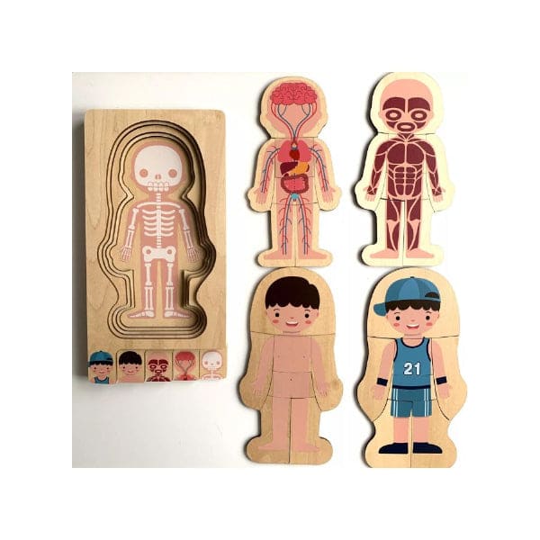 This set of 4-Layer, 28 pieces carefully crafted, beautifully designed, and highly engaging wooden human body anatomy puzzle is a great toy to learn about the human body from the skeletal level to the clothing level. This puzzle covers 5 principal concepts of the human body:
