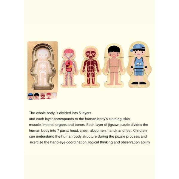 - Each of the five layers wooden puzzle focuses on a different system that exists within the human body (skeletal, respiratory, digestive, muscular, and integumentary/skin)