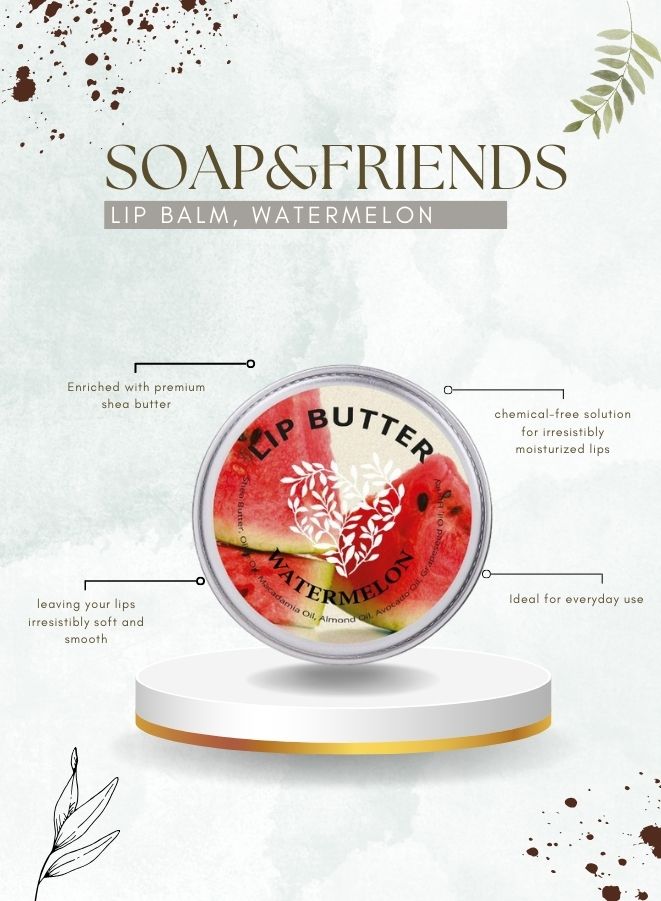 Experience the refreshing, fruity care of the Soap&Friends Watermelon Lip Balm and Scrub Set, a luxurious duo designed to exfoliate and hydrate your lips. This set features two 15 ml products made from natural ingredients, offering a complete lip care solution. The watermelon-flavored lip scrub gently removes dead skin cells, revealing soft, smooth lips, while the nourishing lip balm provides intense hydration, locking in moisture for all-day comfort. With its delightful watermelon scent and natural formulation, this lip care set offers a fun and effective way to keep your lips feeling soft and looking beautiful.