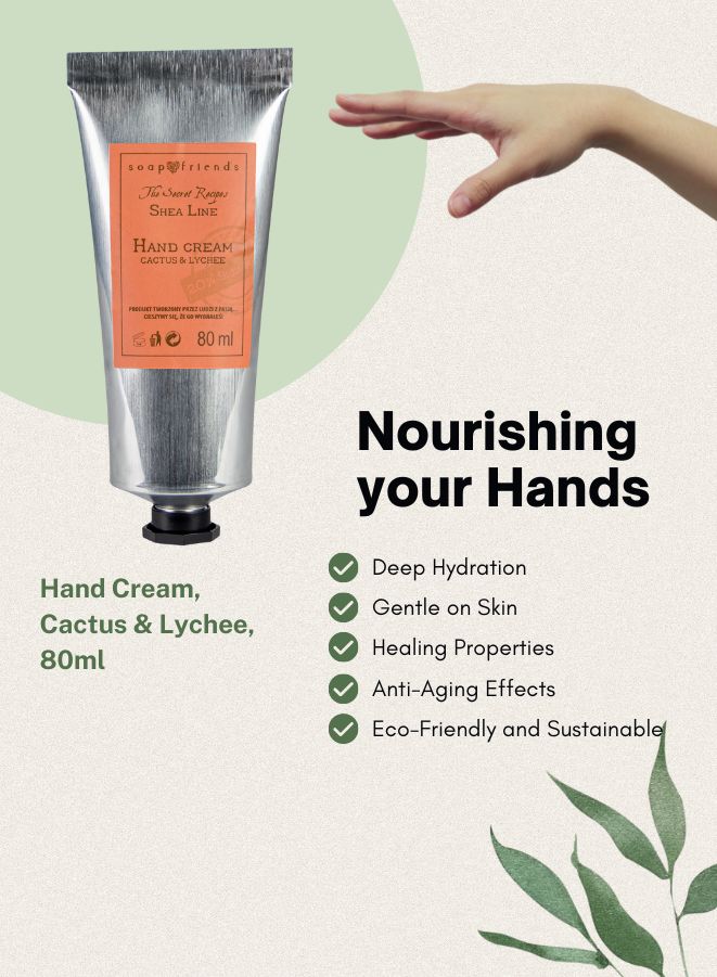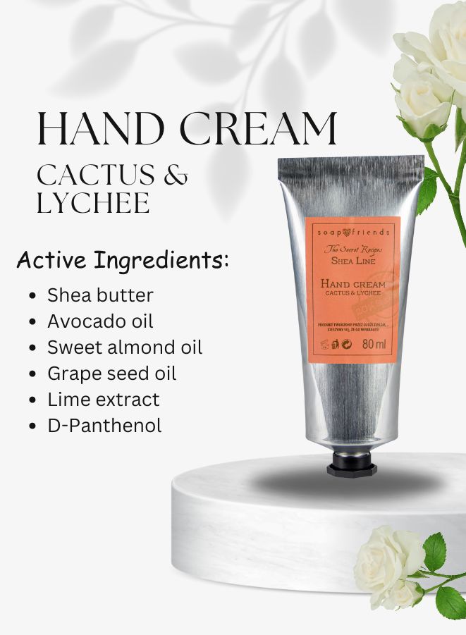 Elevate your skincare ritual with the refreshing blend of nature’s finest in Soap&Friends Exotic Hand Cream – Cactus & Lychee, 80ml. Formulated with 20% organic shea butter, this exotic hand moisturizer delivers deep hydration while pampering your senses with a unique fusion of cactus extract and lychee essence.