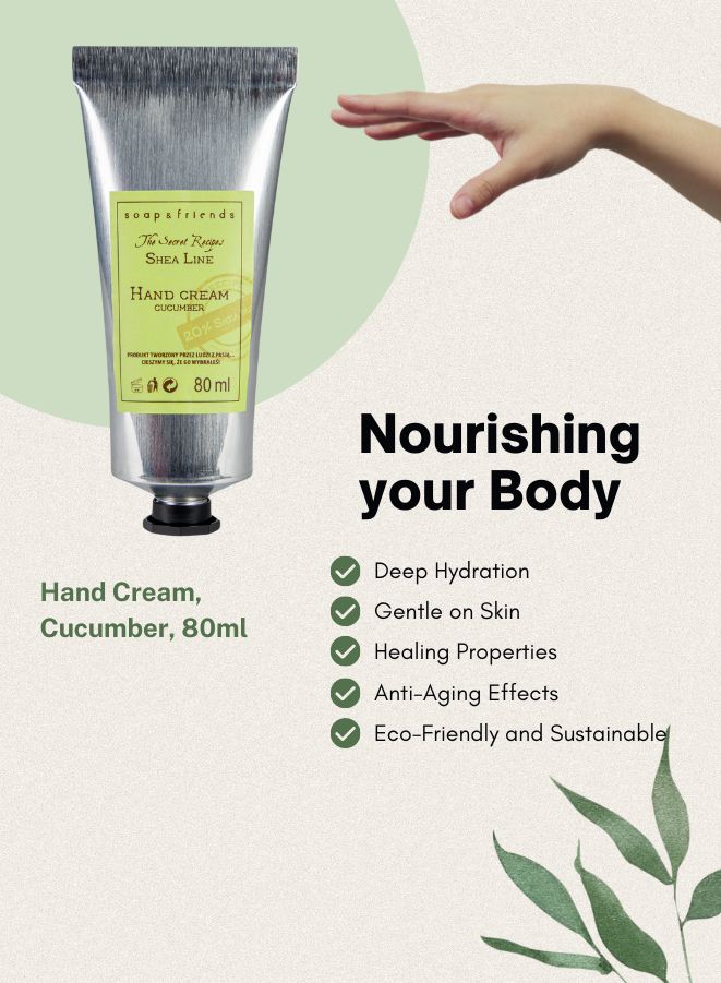 Give your hands the care they deserve with the Soap&Friends Hydrating Hand Cream with 20% Organic Shea Butter and Cucumber – 80ml, specially formulated to restore moisture, soothe irritation, and promote healthy skin renewal. This powerful yet gentle hand cream combines nature’s best hydrating and healing ingredients in one clean, cruelty-free formula.