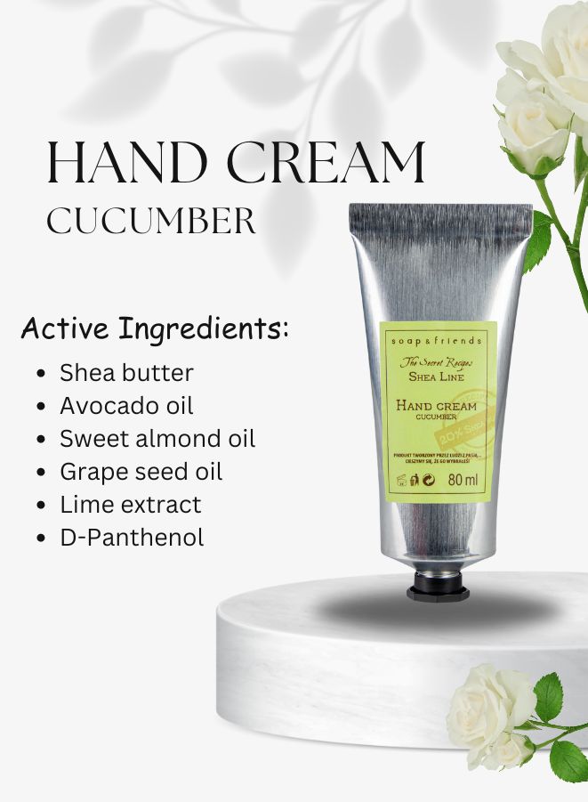 With 20% organic shea butter, this rich cream deeply penetrates the skin to deliver long-lasting hydration, while helping to repair cracked or dry hands. Infused with natural cucumber extract, known for its cooling and anti-inflammatory benefits, it leaves your hands feeling refreshed, soothed, and beautifully soft after each use.