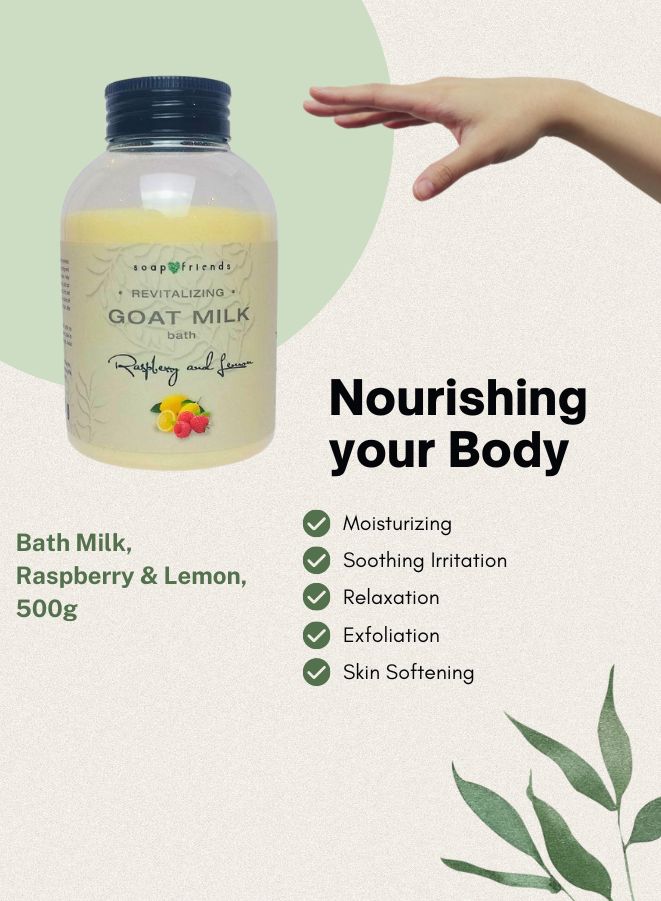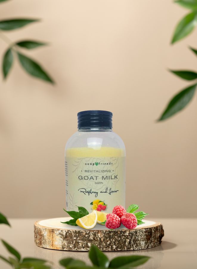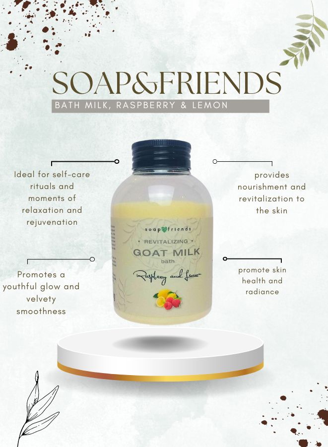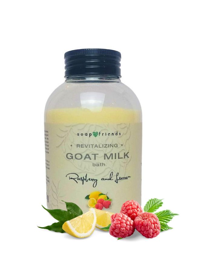 Indulge in a luxurious skin-softening soak with Soap&Friends Goat Milk Bath Milk with Raspberry & Lemon, enriched with goat milk proteins known for their deep cleansing, nourishing, and anti-aging properties. This natural bath milk helps to moisturize, firm, and rejuvenate your skin, making it smooth and youthful with regular use. Infused with a sweet, calming aroma of raspberry and lemon, it transforms every bath into a relaxing spa-like experience. Whether for a full-body soak or pampering manicure and pedicure treatments, this nourishing formula is your go-to for glowing, healthy skin.