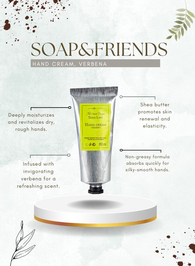 Elevate your skincare routine with the Soap&Friends Verbena Hand Cream and Bar Soap Set. This delightful duo features an 80 ml Hand Cream and a 130 g Bar Soap, both enriched with the refreshing scent of verbena. These products are designed to hydrate, nourish, and rejuvenate your skin, making them perfect for everyday use.