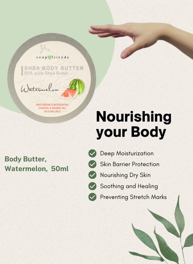 Watermelon 80% Shea Butter Moisturizer with Avocado Oil - 50 ml: Quench your skin's thirst with our Watermelon 80% Shea Butter Moisturizer, formulated with avocado oil for intense hydration. This travel-friendly moisturizer deeply nourishes and moisturizes your skin, leaving it feeling soft, smooth, and deeply hydrated. The refreshing scent of watermelon delights your senses, making it perfect for a quick pick-me-up anytime, anywhere. Treat yourself to indulgent hydration and pampering with this luxurious blend for a rejuvenated and revitalized feel.