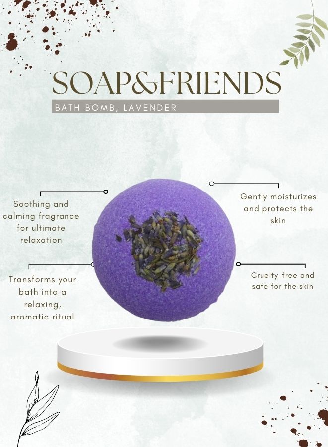 Treat yourself to a calming bath with Soap&Friends Lavender Bath Bomb, 110 g. Expertly crafted to provide a soothing, aromatherapeutic soak, this fizzy bath bomb releases a gentle lavender fragrance that transports you to a peaceful evening.