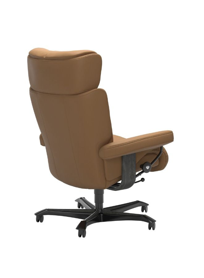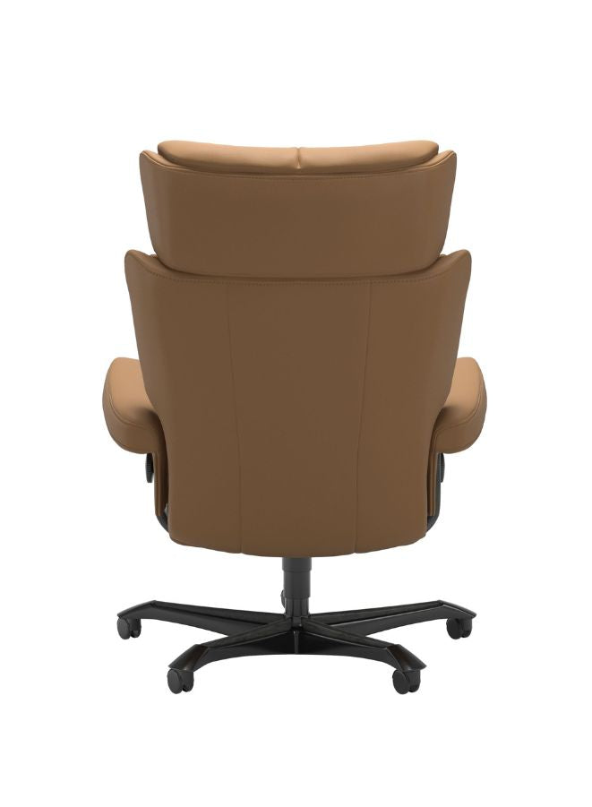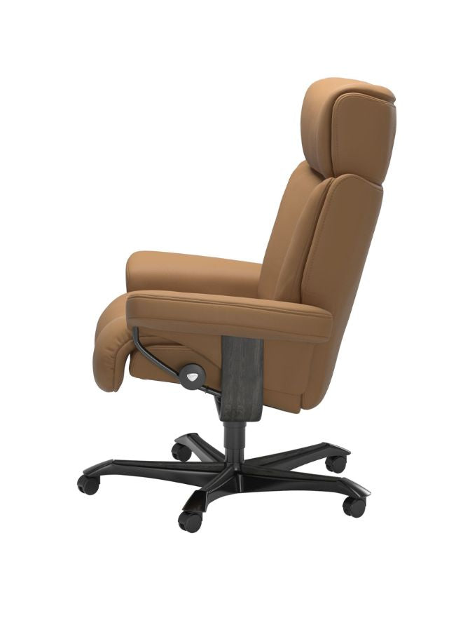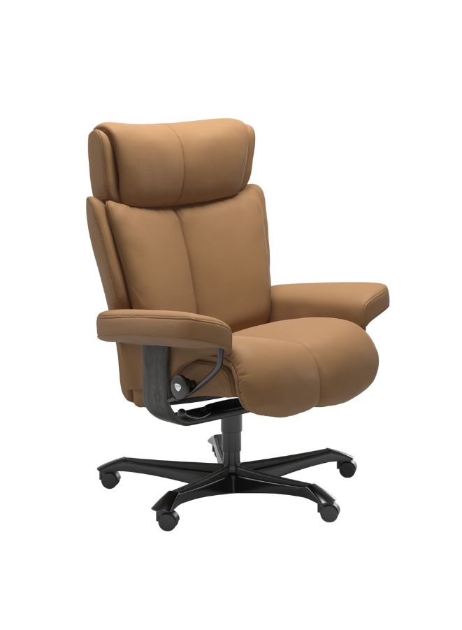 Experience true comfort and functionality with the Stressless® Magic Home Office Chair, a perfect blend of luxury, craftsmanship, and ergonomic innovation. Designed with the same advanced technology found in Stressless Recliners, this chair offers exceptional lumbar and head support whether you sit upright or recline. The Glide™ system allows you to adjust your sitting position effortlessly using your body weight, while the Plus™ system ensures continuous neck and back support for maximum comfort. Upholstered in Paloma leather, it combines natural texture, softness, and a refined look that elevates any home office interior. Complete with a height-adjustable seat, smooth-rolling wheels, and a stylish base, this chair is as elegant as it is supportive — perfect for those who value both comfort and design in their workspace.