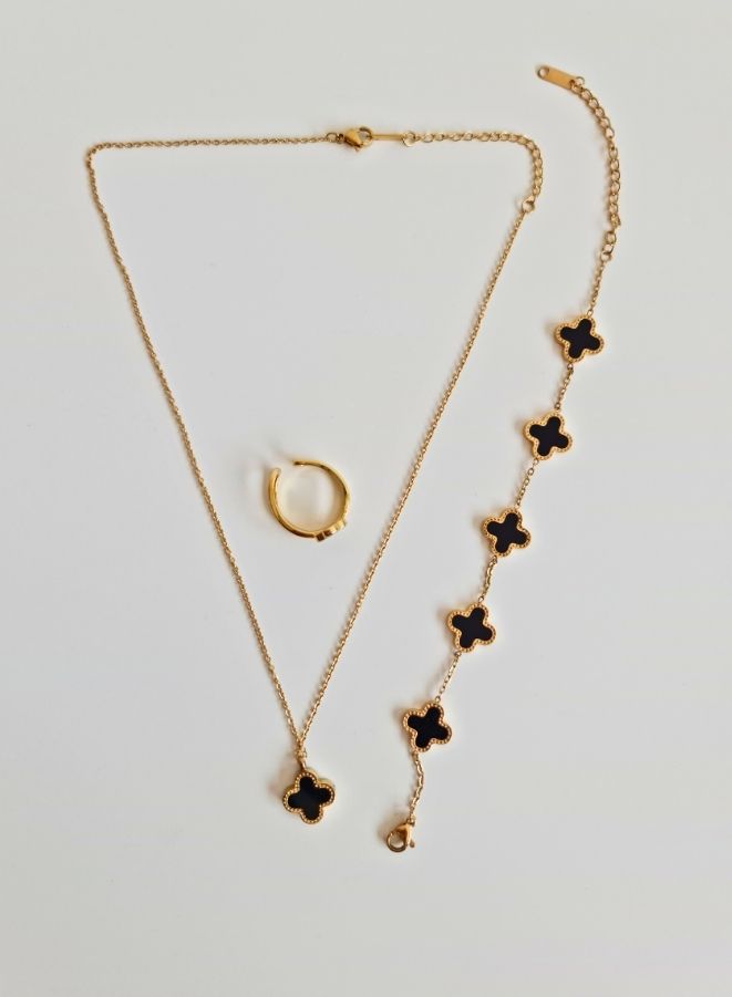Elevate your style with our Stunning Women's Four Leaf Black colored Clover Set—a complete jewelry ensemble that exudes elegance and charm. This set includes a beautifully crafted ring, a delicate chain necklace, and an eye-catching bracelet, all adorned with the timeless symbol of luck and good fortune, the four-leaf clover. This collection is perfect for those who seek a coordinated look that radiates sophistication and a touch of luck.